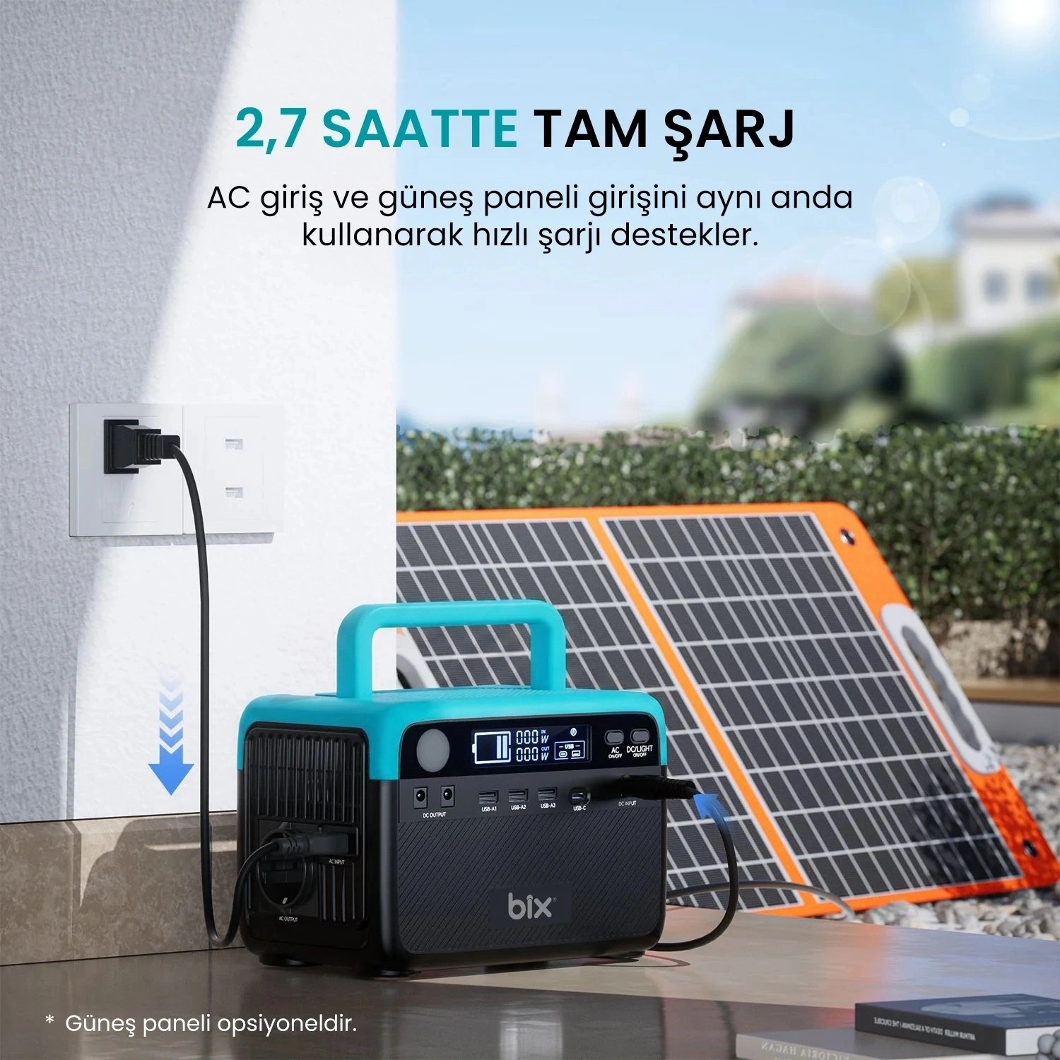 Bix PS60K hem AC prizden hem de güneş panelinden şarj edilebilir.