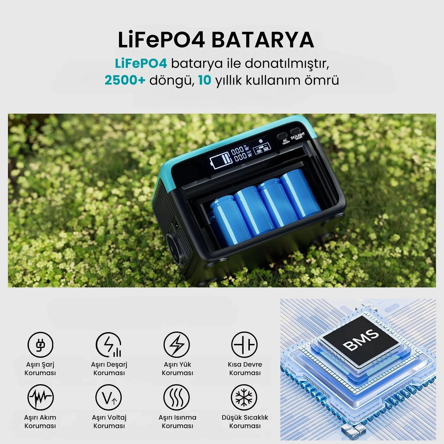 Lityum Demir Fosfat (LiFePO4) batarya, geleneksel lityum-ion bataryalara göre daha güvenlidir, daha uzun ömürlüdür ve yüksek sıcaklıklara dayanıklıdır. Güç bankası formunda tasarlanmış yüksek kapasiteli bir power station olup günlük kullanımda ve acil durumlarda güvenli enerji sunar. LiFePO4 bataryası, hem yüksek sıcaklıklara dayanıklıdır hem de 2500’den fazla şarj-deşarj döngüsüyle uzun ömürlü kullanım sağlar.